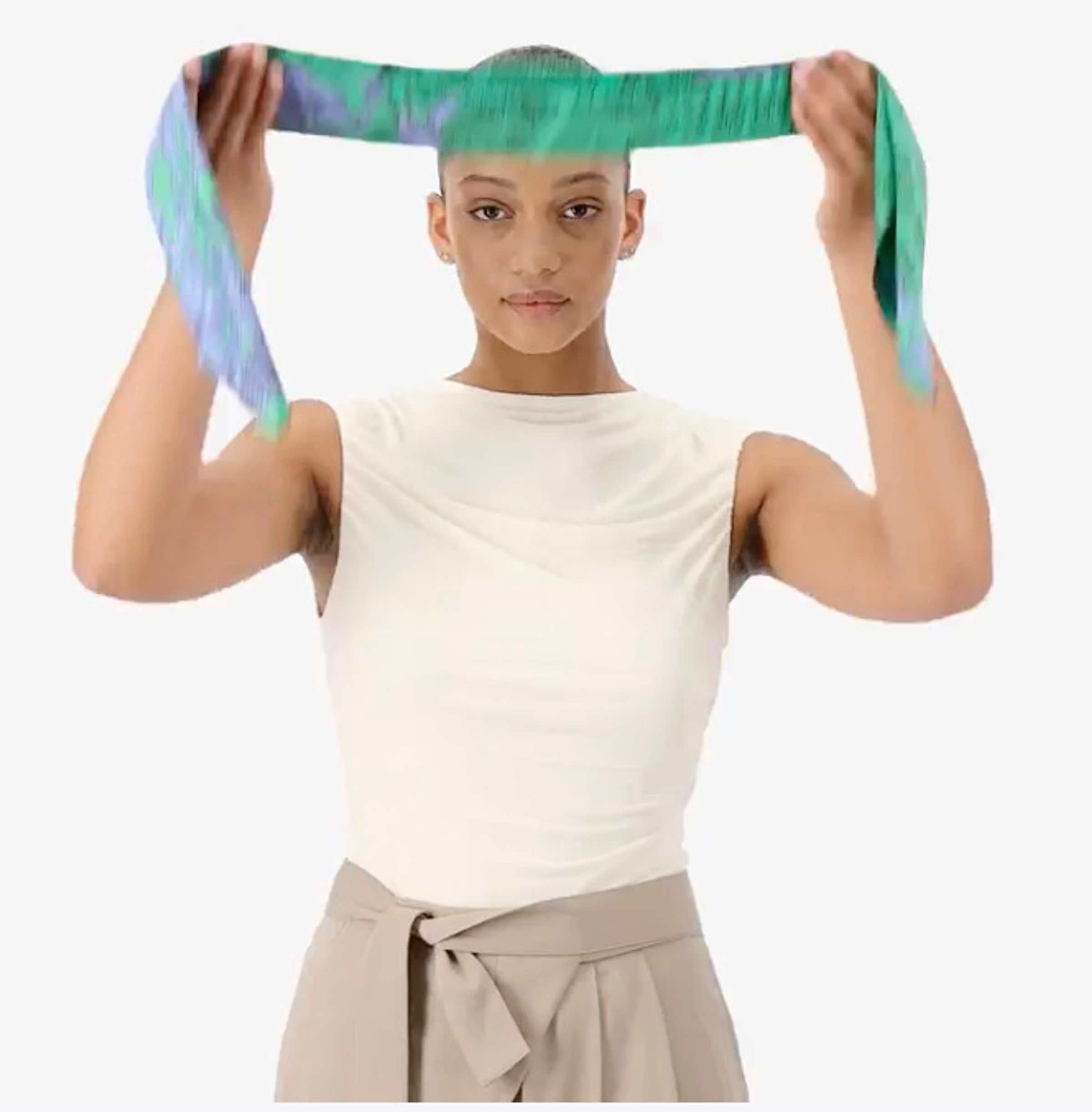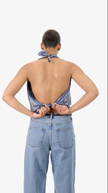 1. Pliez votre carré en deux pour former un grand triangle. 2. Positionnez la pointe du triangle vers le bas, au niveau de votre poitrine. 3. Ramenez les deux extrémités autour de votre dos et nouez-les fermement. 4. Ajustez le tissu pour qu’il soit bien centré : un bustier simple et élégant.