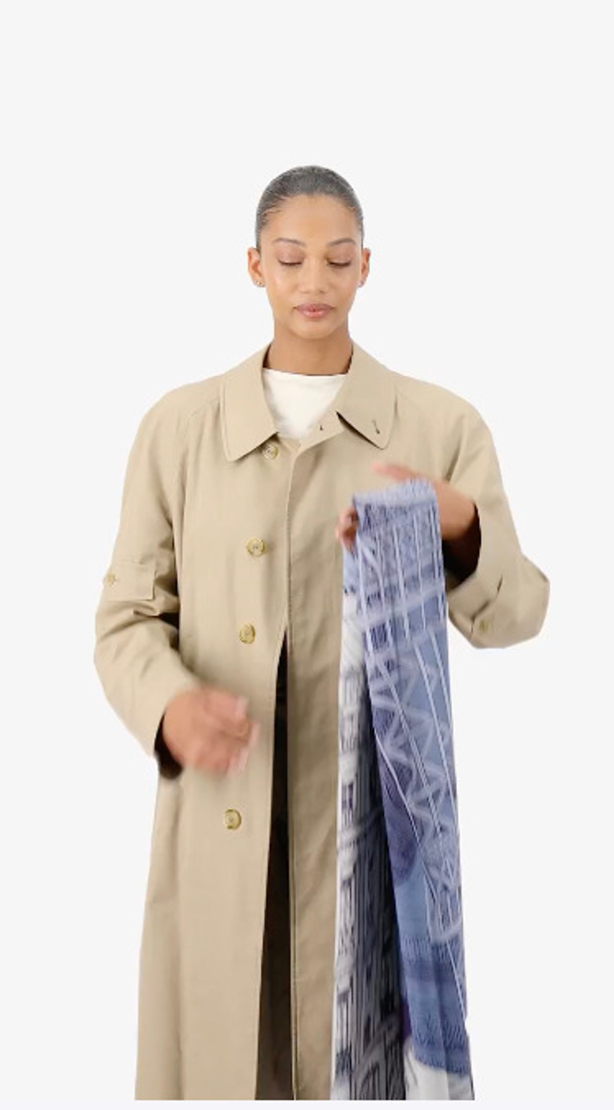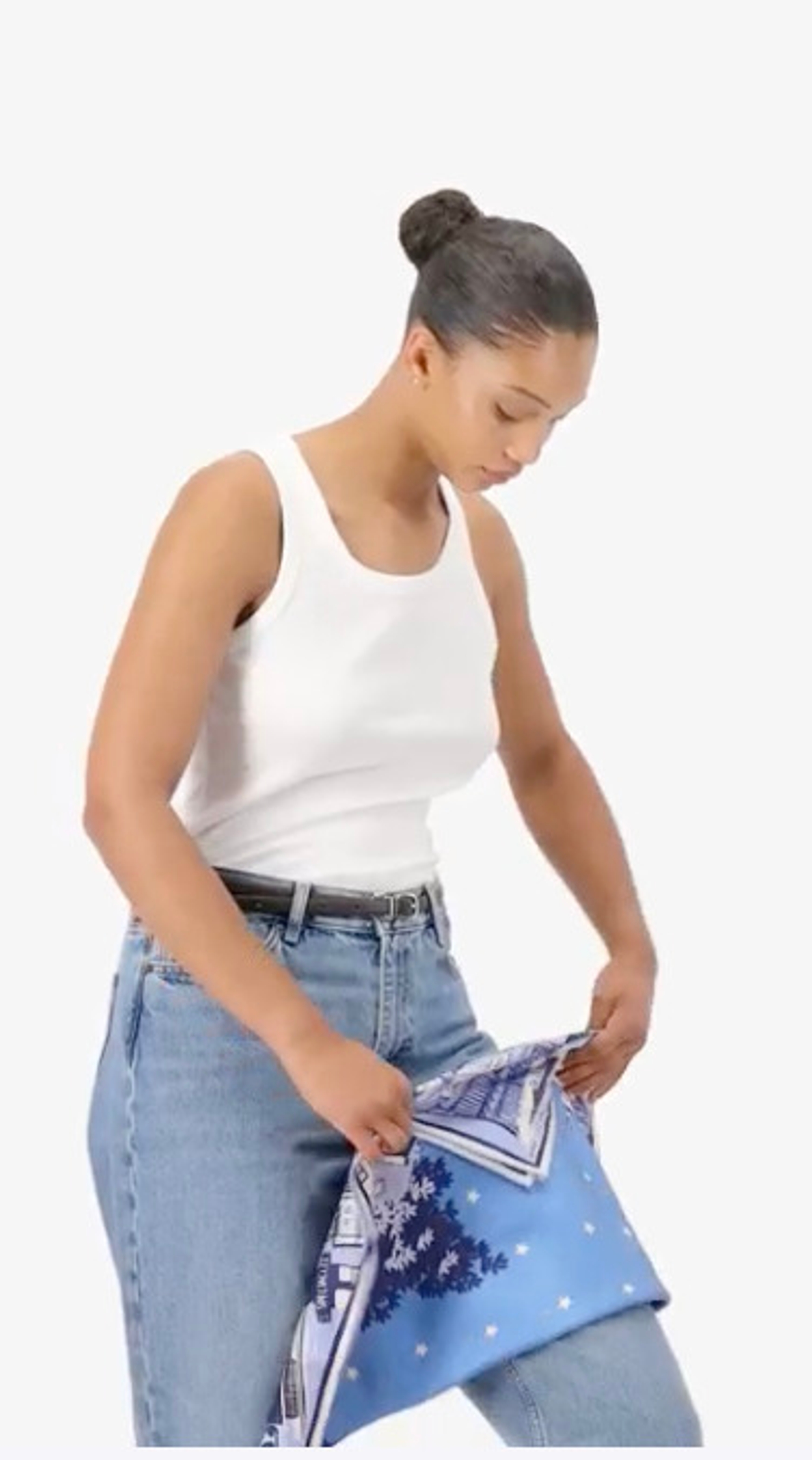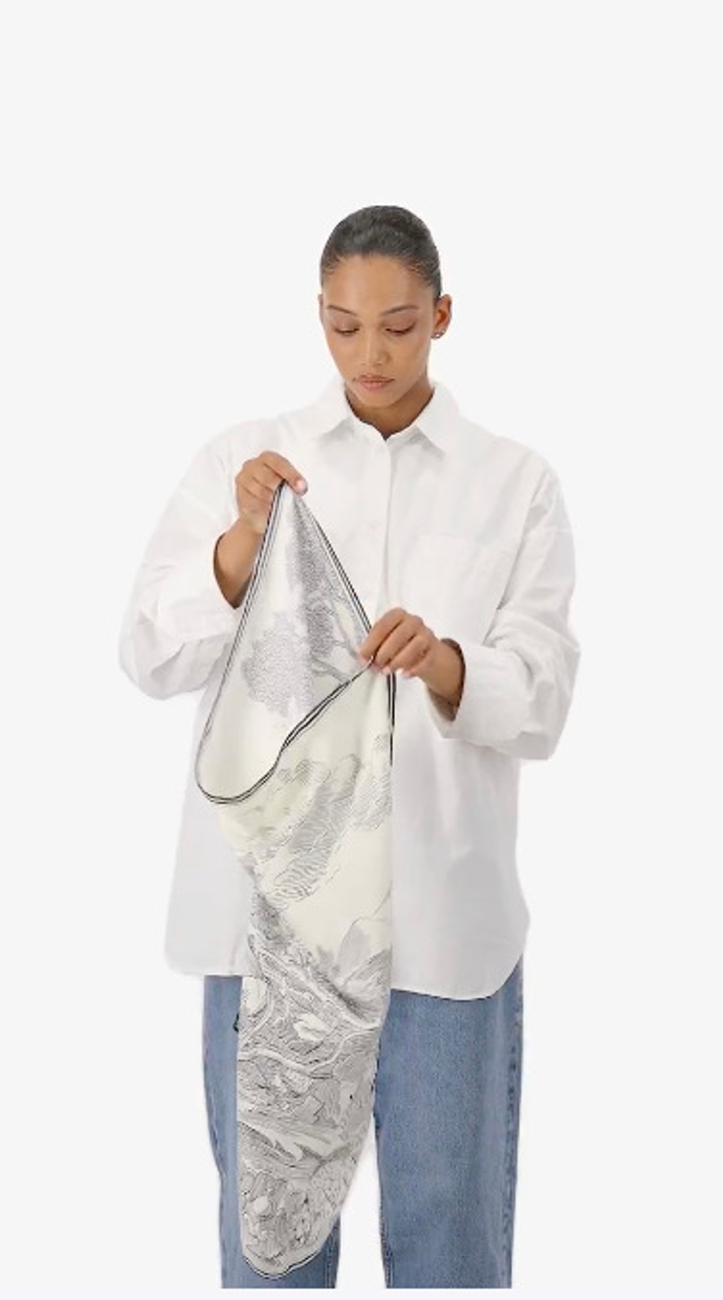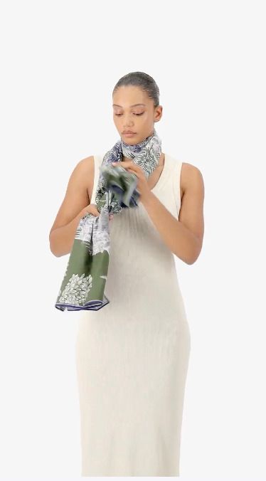 1. Pliez votre carré de soie plusieurs fois jusqu’à obtenir une bande longue et régulière. 2. Passez-la autour de votre cou en laissant les deux extrémités tomber devant. 3. Nouez-les simplement, comme un nœud basique. 4. Ajustez le foulard : un détail discret qui change toute la tenue.
