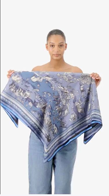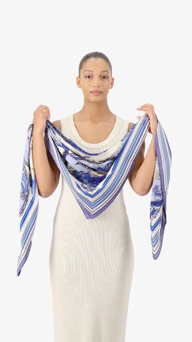 1. Pliez votre carré en deux pour former un triangle. 2. Passez-le autour de votre cou, pointe vers l’avant. 3. Ramenez les deux extrémités devant et nouez-les simplement. 4. Ajustez le foulard pour un rendu élégant et majestueux.