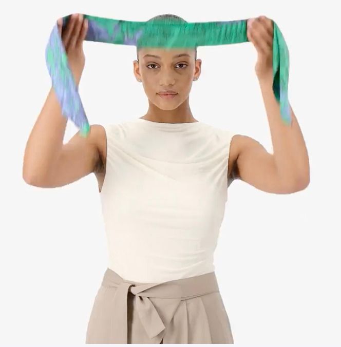 1. Prenez un carré de soie. 2. Attachez deux extrémités autour de votre cou. 3. Ramenez les deux autres extrémités dans le dos et nouez-les. 4. Ne serrez pas trop le foulard pour créer un effet drapé élégant.