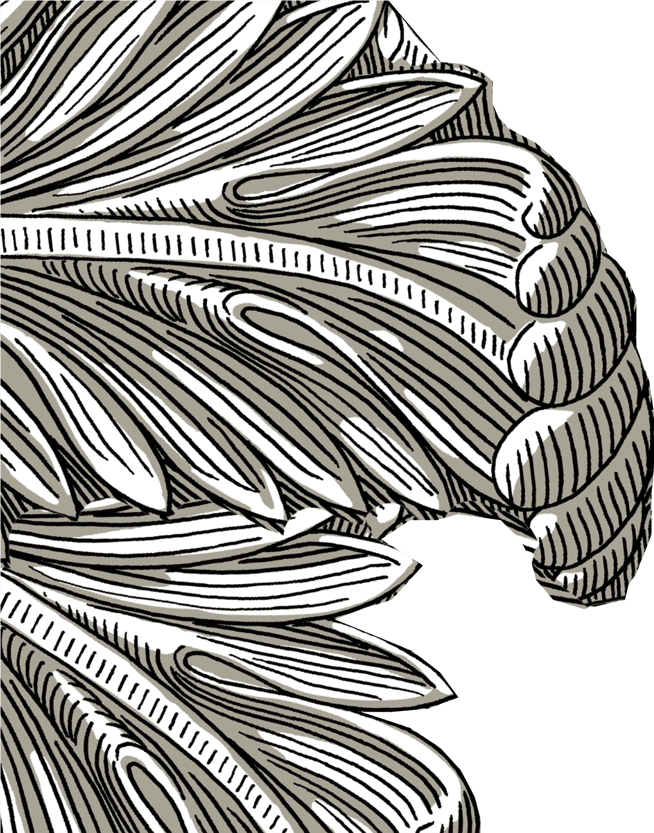Pour le motif Architecture, Inoui Editions imagine un modèle inspiré de l’architecture du musée dessiné et gravé par Baltard et compose un patchwork de colonnes d'arches et d'escaliers en jouant sur les profondeurs. Le traité graphique reprend l'esthétique des papiers peints à la gouache du XIXème siècle, entre ombre et lumière.